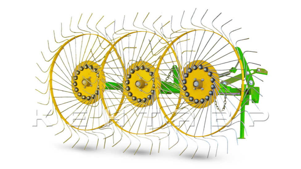 Рабочие колеса граблей имеют диаметр 1,2 метра, они оснащены спицами заводского производства, изготовленными из высокопрочной пружинной стали толщиной 6 мм и окрашены порошковой краской. Диск крепления спиц усилен в сравнении с польскими производителями, имеет толщину 5 мм. Колеса установлены на двух 205 подшипниках, что обеспечивает надежную и длительную эксплуатацию. Усиленная несущая труба граблей с толщиной стенки 3,5 мм придает конструкции дополнительную прочность.