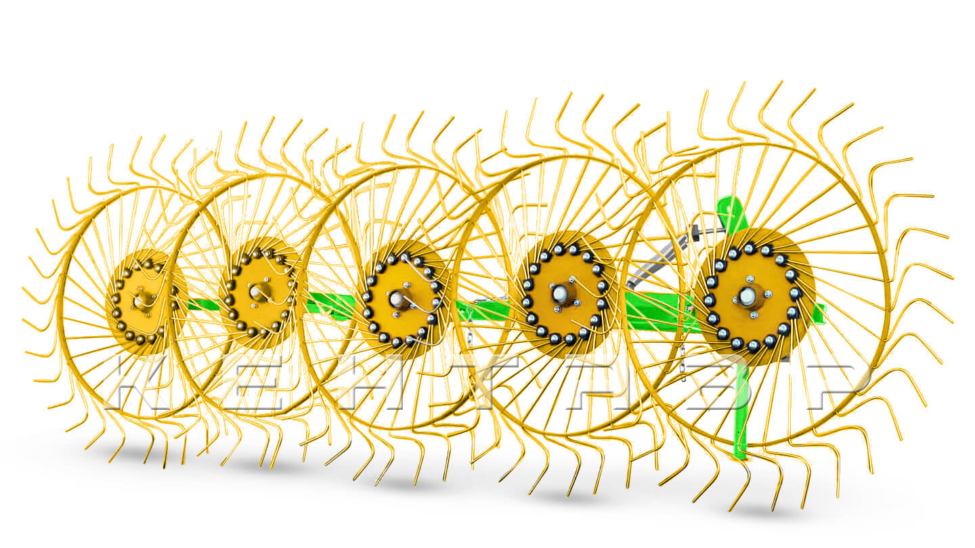 Рабочие колеса граблей имеют диаметр 1,2 метра и оснащены спицами заводского производства, изготовленными из высокопрочной пружинной стали толщиной 6 мм и окрашены порошковой краской. Диск крепления спиц усилен и имеет толщину 5 мм. Колеса установлены на двух 205 подшипниках, гарантируя надежную и длительную эксплуатацию.